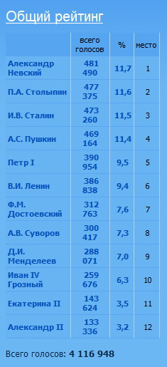 1. Александр Невский 481 490 (11,7) 2. П.А. Столыпин 477 375 (11,6) 3. И.В. Сталин 473 260 (11,5) 4. А.С. Пушкин 469 164 (11,4) 5. Петр I 390 954 (9,5) 6. В.И. Ленин 386 838 (9,4) 7. Ф.М. Достоевский 312 763 (7,6) 8. А.В. Суворов 300 417 (7,3) 9. Д.И. Менделеев 288 071 (7,0) 10. Иван IV Грозный 259 676 (6,3) 11. Екатерина II 143 624 (3,5) 12. Александр II 133 336 (3,2) Весит на главной странице, не знаю когда оно обновилось, судя по процентам во время вчерашней передаче "в прямом эфире", но на прежней странице суммарного рейтинга данные так и весят за 26 число. Если кто заходил на главную страницу просветите в данном вопросе, так что следим за привычной и главной странице ну и интернет рейтингом, в общем смотрим в оба и публикуем свежую информацию!