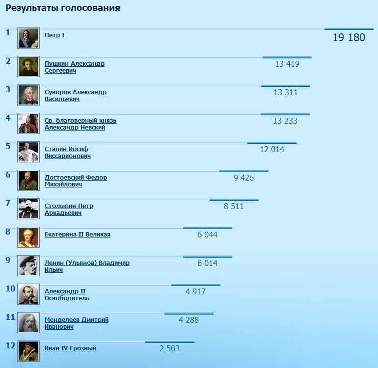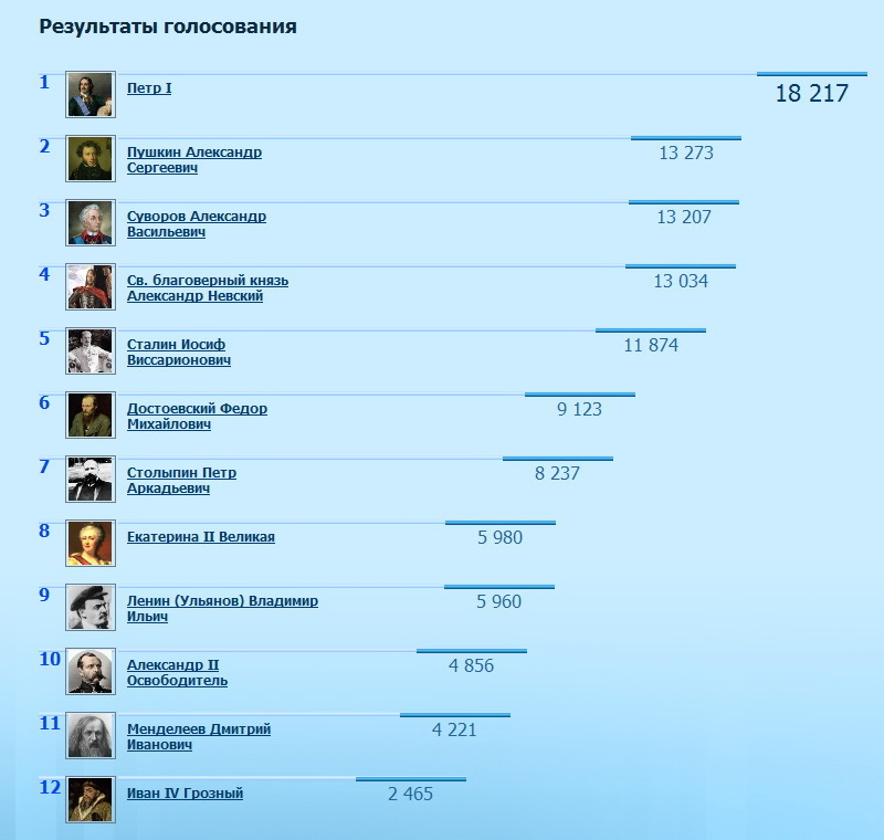 1 Петр I 19 180 2 Пушкин Александр Сергеевич 13 419 3 Суворов Александр Васильевич 13 311 4 Св. благоверный князь Александр Невский 13 233 5 Сталин Иосиф Виссарионович 12 014 6 Достоевский Федор Михайлович 9 426 7 Столыпин Петр Аркадьевич 8 511 8 Екатерина II Великая 6 044 9 Ленин (Ульянов) Владимир Ильич 6 014 10 Александр II Oсвободитель 4 917 11 Менделеев Дмитрий Иванович 4 288 12 Иван IV Грозный 2 503
