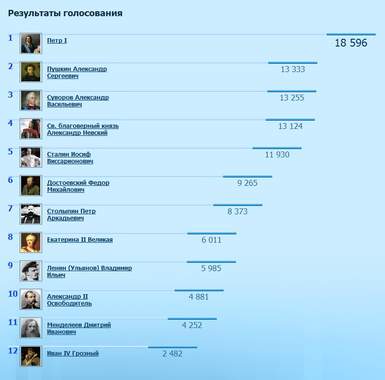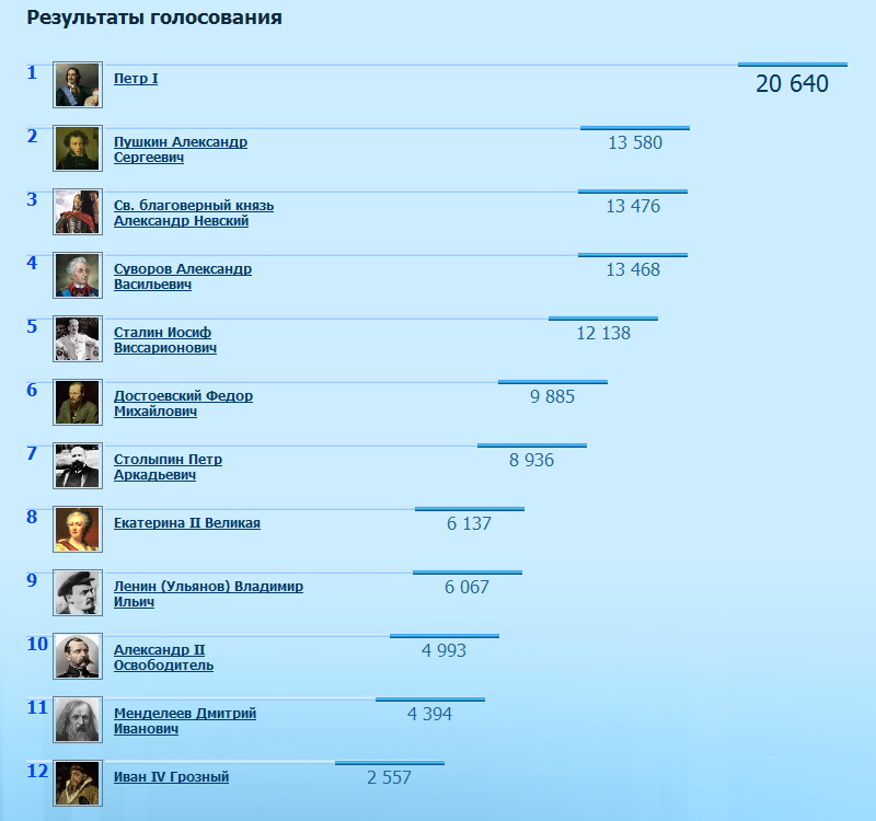 1 Петр I 22 168 2 Пушкин Александр Сергеевич 13 695 3 Св. благоверный князь Александр Невский 13 668 4 Суворов Александр Васильевич 13 547 5 Сталин Иосиф Виссарионович 12 256 6 Достоевский Федор Михайлович 10 140 7 Столыпин Петр Аркадьевич 9 259 8 Екатерина II Великая 6 178 9 Ленин (Ульянов) Владимир Ильич 6 096 10 Александр II Oсвободитель 5 035 11 Менделеев Дмитрий Иванович 4 437 12 Иван IV Грозный 2 580