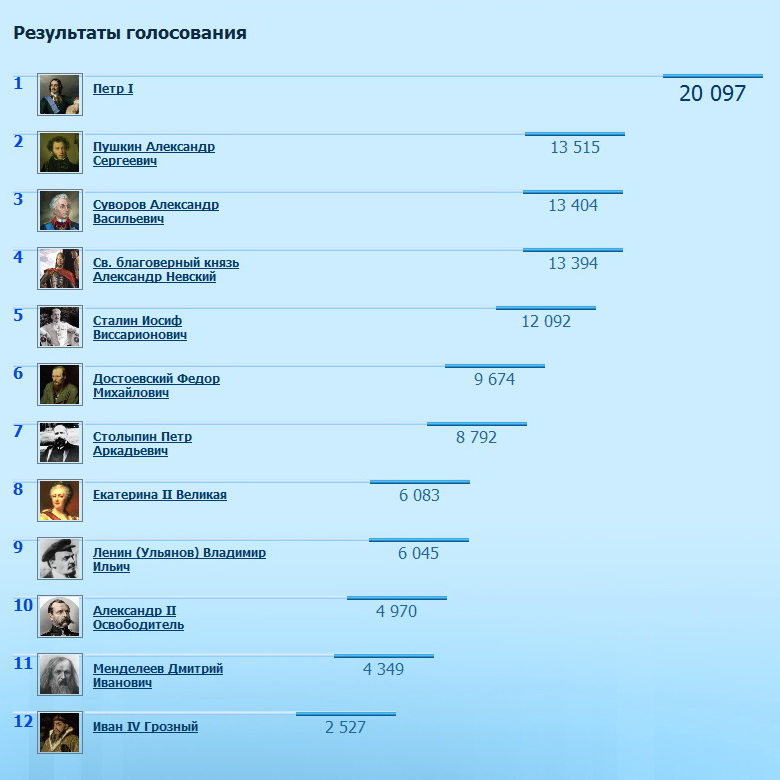 1 Петр I 20 097 2 Пушкин Александр Сергеевич 13 515 3 Суворов Александр Васильевич 13 404 4 Св. благоверный князь Александр Невский 13 394 5 Сталин Иосиф Виссарионович 12 092 6 Достоевский Федор Михайлович 9 674 7 Столыпин Петр Аркадьевич 8 792 8 Екатерина II Великая 6 083 9 Ленин (Ульянов) Владимир Ильич 6 045 10 Александр II Oсвободитель 4 970 11 Менделеев Дмитрий Иванович 4 349 12 Иван IV Грозный 2 527