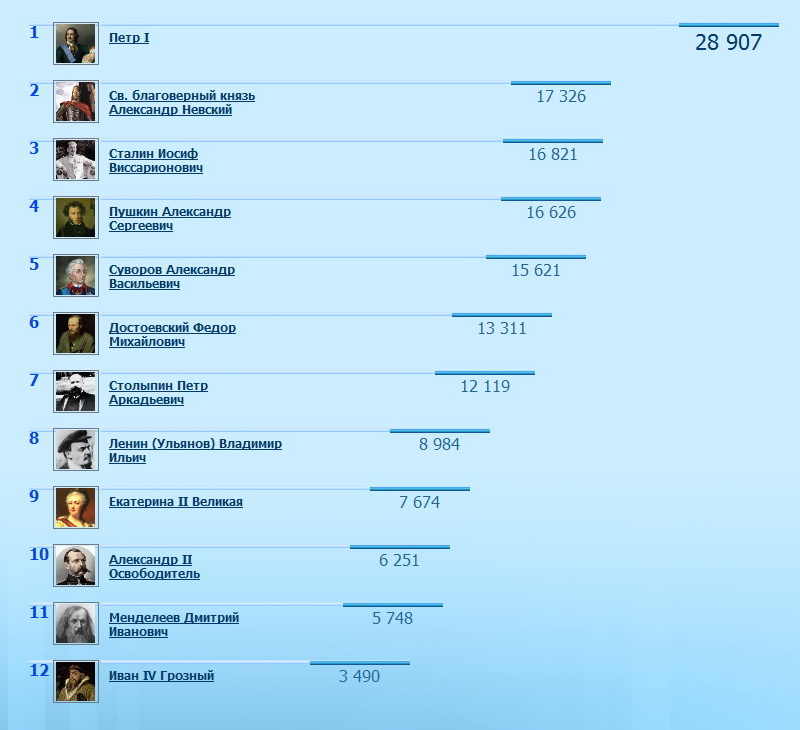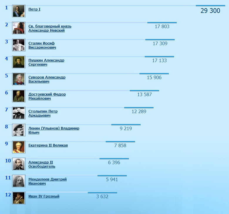1 Петр I 28 693 2 Св. благоверный князь Александр Невский 17 092 3 Сталин Иосиф Виссарионович 16 610 4 Пушкин Александр Сергеевич 16 439 5 Суворов Александр Васильевич 15 502 6 Достоевский Федор Михайлович 13 233 7 Столыпин Петр Аркадьевич 12 041 8 Ленин (Ульянов) Владимир Ильич 8 864 9 Екатерина II Великая 7 582 10 Александр II Oсвободитель 6 180 11 Менделеев Дмитрий Иванович 5 670 12 Иван IV Грозный 3 439