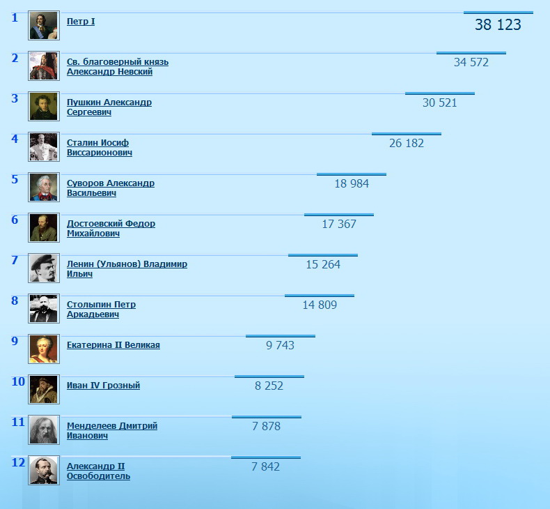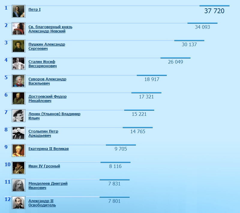 1 Петр I 38 123 2 Св. благоверный князь Александр Невский 34 572 3 Пушкин Александр Сергеевич 30 521 4 Сталин Иосиф Виссарионович 26 182 5 Суворов Александр Васильевич 18 984 6 Достоевский Федор Михайлович 17 367 7 Ленин (Ульянов) Владимир Ильич 15 264 8 Столыпин Петр Аркадьевич 14 809 9 Екатерина II Великая 9 743 10 Иван IV Грозный 8 252 11 Менделеев Дмитрий Иванович 7 878 12 Александр II Oсвободитель 7 842