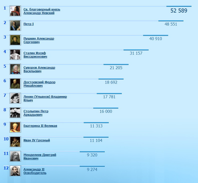 1 Св. благоверный князь Александр Невский 52 589 2 Петр I 48 551 3 Пушкин Александр Сергеевич 40 910 4 Сталин Иосиф Виссарионович 31 157 5 Суворов Александр Васильевич 21 205 6 Достоевский Федор Михайлович 18 692 7 Ленин (Ульянов) Владимир Ильич 17 781 8 Столыпин Петр Аркадьевич 16 000 9 Екатерина II Великая 11 313 10 Иван IV Грозный 11 104 11 Менделеев Дмитрий Иванович 9 320 12 Александр II Oсвободитель 9 274