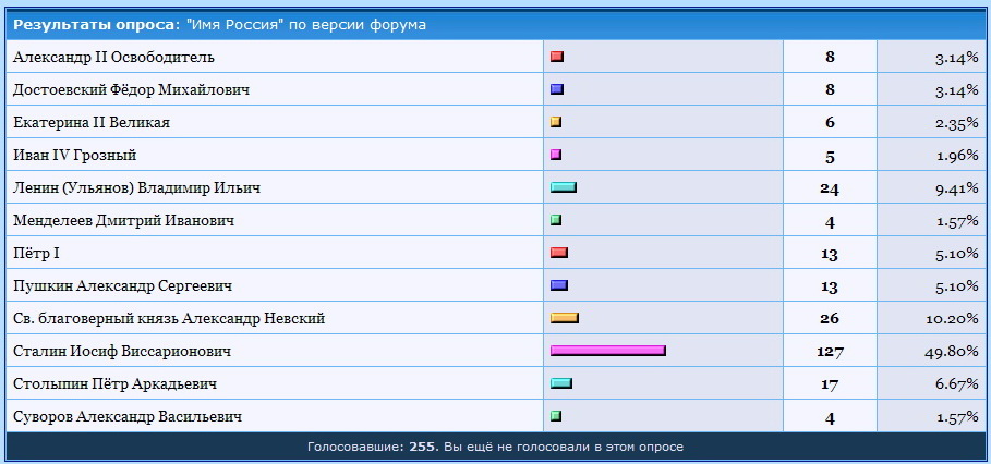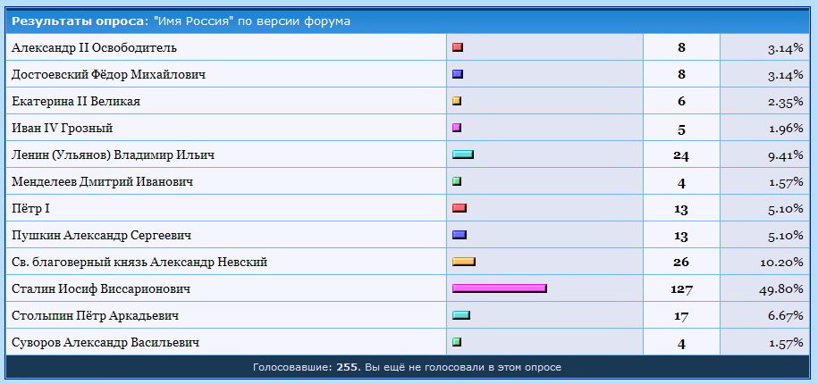 1 Св. благоверный князь Александр Невский 66 665 2 Петр I 52 467 3 Пушкин Александр Сергеевич 45 461 4 Сталин Иосиф Виссарионович 34 448 5 Суворов Александр Васильевич 23 569 6 Достоевский Федор Михайлович 20 319 7 Ленин (Ульянов) Владимир Ильич 19 549 8 Столыпин Петр Аркадьевич 17 432 9 Екатерина II Великая 12 840 10 Иван IV Грозный 12 248 11 Менделеев Дмитрий Иванович 11 161 12 Александр II Oсвободитель 10 687 P.S. Просьба в моё отсутствие следить за результатами (и затем что происходит на проекте) и публиковать их здесь в теме.