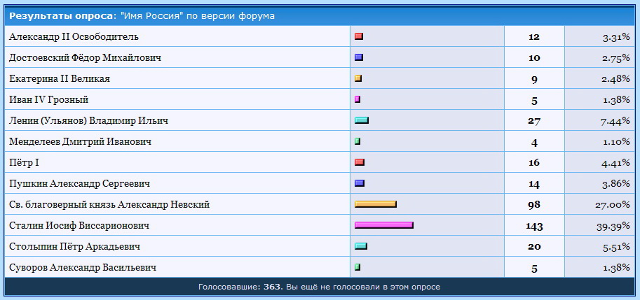 Вот данные (скриншоты прилагаются) 18 октября в 6 утра на форуме "Имя Россия" в опросе за 12 кандидатов было отдано 212 голосов, из них Сталин получил 108 (50.94%), Ленин 22 (10.38%), Невский 18 (8.49%). 21 октября в 02-30, была схожая картина, всего на тот момент было 255 голосов, у Сталина было 127 (49.8%), у Ленина 24 (9.41%) у Невского 26 (10.2%). 23 октября в 20-00 было всего 275 голосов, из них у Сталина 135 (49.09%) у Ленина 25 (9.09%) У Невского 30 (10.91%) . А сегодня 26 октября с утра уже резко стало 363 голоса, из них у Сталина 143 (39.39%) А Невский резко поднялся до 98 (27.00%), вот такие вот дела, в этот период как раз было зарегистрировано куча клонов, которые не имеют сообщений, они видимо и голосовали.