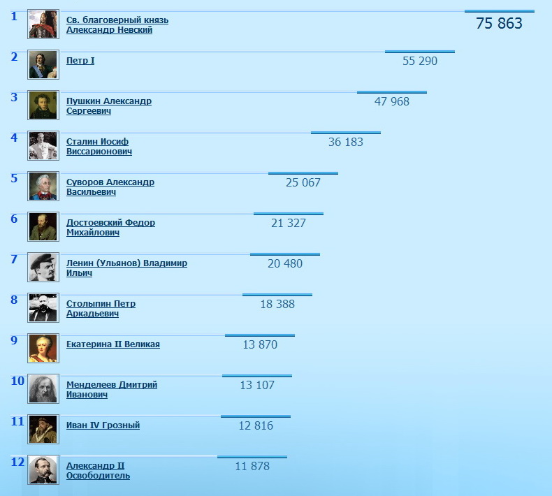 1 Св. благоверный князь Александр Невский 74 781 2 Петр I 54 416 3 Пушкин Александр Сергеевич 47 594 4 Сталин Иосиф Виссарионович 35 935 5 Суворов Александр Васильевич 24 847 6 Достоевский Федор Михайлович 21 168 7 Ленин (Ульянов) Владимир Ильич 20 341 8 Столыпин Петр Аркадьевич 18 231 9 Екатерина II Великая 13 707 10 Иван IV Грозный 12 732 11 Менделеев Дмитрий Иванович 12 454 12 Александр II Oсвободитель 11 487