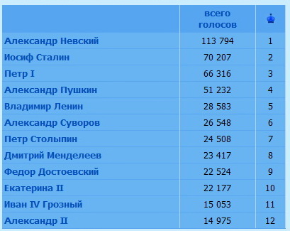 Александр Невский 113 794 1 Иосиф Сталин 70 207 2 Петр I 66 316 3 Александр Пушкин 51 232 4 Владимир Ленин 28 583 5 Александр Суворов 26 548 6 Петр Столыпин 24 508 7 Дмитрий Менделеев 23 417 8 Федор Достоевский 22 524 9 Екатерина II 22 177 10 Иван IV Грозный 15 053 11 Александр II 14 975 12