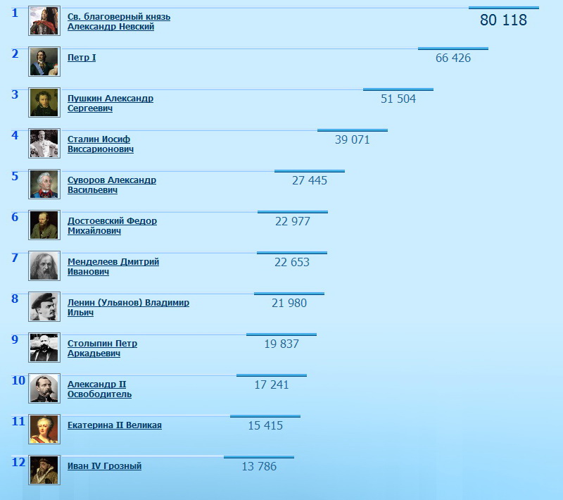 1 Св. благоверный князь Александр Невский 80 155 2 Петр I 66 567 3 Пушкин Александр Сергеевич 51 534 4 Сталин Иосиф Виссарионович 39 080 5 Суворов Александр Васильевич 27 465 6 Достоевский Федор Михайлович 22 988 7 Менделеев Дмитрий Иванович 22 752 8 Ленин (Ульянов) Владимир Ильич 21 988 9 Столыпин Петр Аркадьевич 19 856 10 Александр II Oсвободитель 17 314 11 Екатерина II Великая 15 435 12 Иван IV Грозный 13 791