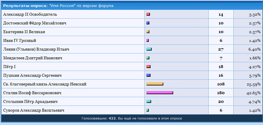 В общем (на 1 ноября 05:00): 422 голоса: 1. Сталин Иосиф Виссарионович - 180 (42.65%) 2. Александр Невский - 108 (25.59%) 3. Владимир Ленин - 27 (6.40%) 4. Столыпин - 20 (4.74%) 5. Пётр Первый -18 (4.27%) 6. Пушкин - 16 (3.79%) 7. Александр II - 14 (3.32%) Остальные имеют 1-2 процента их результаты на скриншоте.