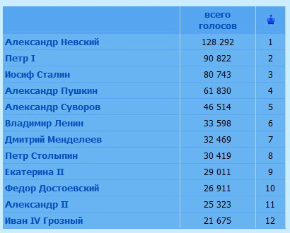 Ниже представляем суммарный рейтинг по итогам телефонного, смс и Интернет голосования на 12.00 (мск) 5 ноября 2008. Александр Невский 128 292 1 Петр I 90 822 2 Иосиф Сталин 80 743 3 Александр Пушкин 61 830 4 Александр Суворов 46 514 5 Владимир Ленин 33 598 6 Дмитрий Менделеев 32 469 7 Петр Столыпин 30 419 8 Екатерина II 29 011 9 Федор Достоевский 26 911 10 Александр II 25 323 11 Иван IV Грозный 21 675 12