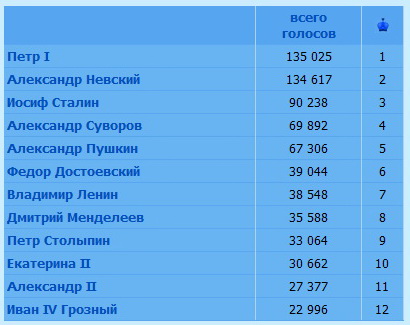 1 Петр I 108 194 2 Св. благоверный князь Александр Невский 93 456 3 Пушкин Александр Сергеевич 62 357 4 Суворов Александр Васильевич 59 277 5 Сталин Иосиф Виссарионович 51 836 6 Ленин (Ульянов) Владимир Ильич 31 516 7 Менделеев Дмитрий Иванович 29 438 8 Столыпин Петр Аркадьевич 28 861 9 Достоевский Федор Михайлович 28 662 10 Екатерина II Великая 26 321 11 Александр II Oсвободитель 25 944 12 Иван IV Грозный 20 800