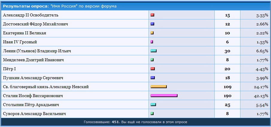 Для истории, 14 ноября 03:20 (msk) на форуме проекта "Имя Россия" на данный момент засчитан 451 голос (всего зарегистрировано участников там 1,617), результаты следующие: