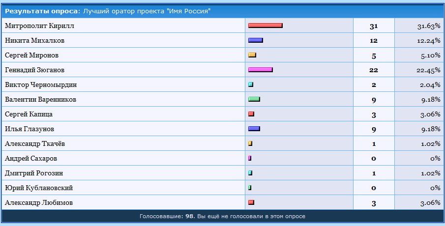 1. Митрополит Кирилл - 31 (31.63%) 2. Геннадий Зюганов - 22 (22.45%) 3. Никита Михалков - 12 (12.24%) 4. Валентин Варенников - 9 (9.18%) 5. Илья Глазунов - 9 (9.18%) 6. Сергей Миронов - 5 (5.10%) Остальные результаты менее значительны, они на скриншоте.