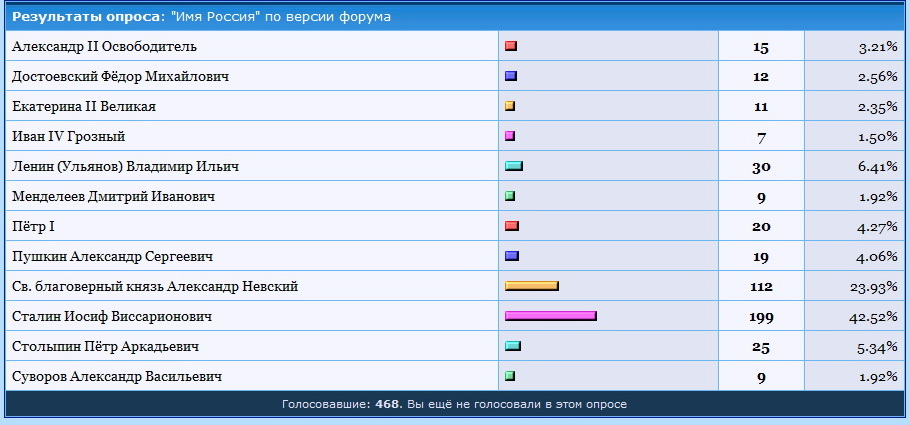 Для истории, результаты голосования на Форуме "Имя Россия" на 20 ноября, 00:20 (msk), всего учтено 468 голосов: