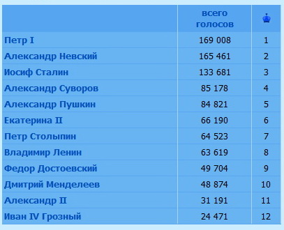 1. Сталин Иосиф Виссарионович - 199 (42.52%) 2. Александр Невский - 112 (23.93%) 3. Ленин Владимир Ильич - 30 (6.41%) 4. Столыпин Пётр Аркадьевич - 25 (5.34%) 5. Пётр I - 20 (4.27%) 6. Пушкин Александр Сергеевич - 19 (4.06%) 7. Александр II Oсвободитель - 15 (3.21%) 8. Достоевский Фёдор Михайлович - 12 (2.56%) 9. Екатерина II Великая - 11 (2.35%) 10. Менделеев Дмитрий Иванович - 9 (1.92%) 11. Суворов Александр Васильевич - 9 (1.92%) 12. Иван IV Грозный - 7 (1.50%)