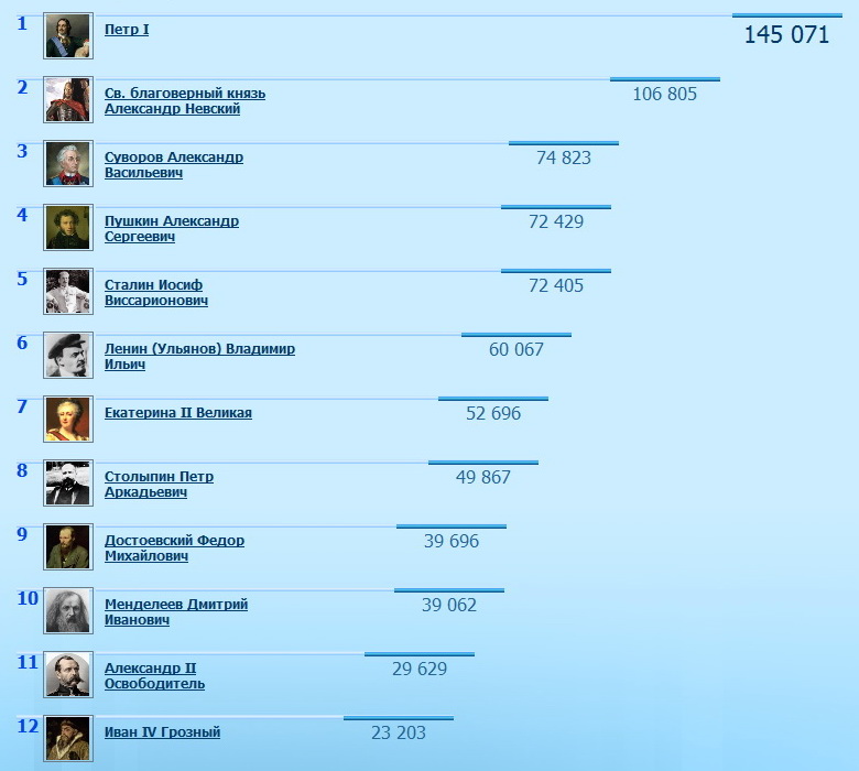 Петр I 169 008 1 Александр Невский 165 461 2 Иосиф Сталин 133 681 3 Александр Суворов 85 178 4 Александр Пушкин 84 821 5 Екатерина II 66 190 6 Петр Столыпин 64 523 7 Владимир Ленин 63 619 8 Федор Достоевский 49 704 9 Дмитрий Менделеев 48 874 10 Александр II 31 191 11 Иван IV Грозный 24 471 12