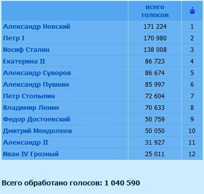 Всего обработано голосов: 1 040 590 1. Александр Невский 171 224 2. Петр I 170 980 3. Иосиф Сталин 138 008 4. Екатерина II 86 723 5. Александр Суворов 86 674 6. Александр Пушкин 85 997 7. Петр Столыпин 72 604 8. Владимир Ленин 70 633 9. Федор Достоевский 50 759 10. Дмитрий Менделеев 50 050 11. Александр II 31 927 12. Иван IV Грозный 25 011
