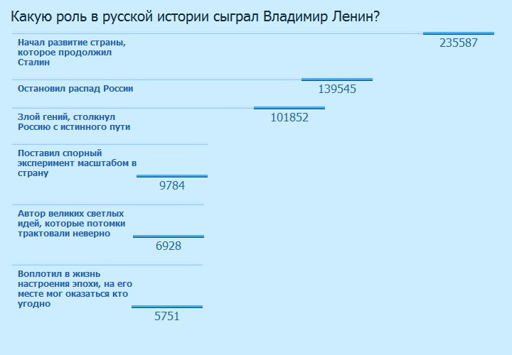 Какую роль в русской истории сыграл Владимир Ленин? 1. Начал развитие страны, которое продолжил Сталин - 235 587 2. Остановил распад России - 139 545 3. Злой гений, столкнул Россию с истинного пути 101 852 4. Поставил спорный эксперимент масштабом в страну 9 784 5. Автор великих светлых идей, которые потомки трактовали неверно 6 928 6. Воплотил в жизнь настроения эпохи, на его месте мог оказаться кто угодно 5 751 --- Как видим из результатов, людей положительно оценивающих роль в истории Ленина примерно в 3.5 раза больше проголосовало, чем тех кто роль Ленина считает отрицательной.
