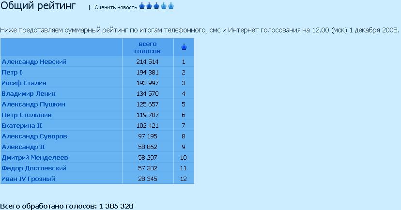 всего голосов 1.Александр Невский 214 514 2.Петр I 194 381 3.Иосиф Сталин 193 997 4.Владимир Ленин 134 570 5.Александр Пушкин 125 657 6.Петр Столыпин 119 787 7.Екатерина II 102 421 8.Александр Суворов 97 195 9.Александр II 58 862 10.Дмитрий Менделеев 58 297 11.Федор Достоевский 57 302 12.Иван IV Грозный 28 345 Всего обработано голосов: 1 385 328 Последний раз редактировалось dikson; 01.12.2008 в 17:08. |