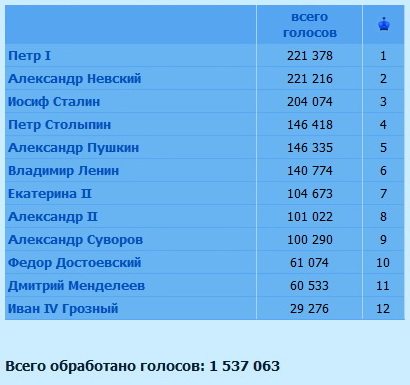 1. Петр I 221 378 2. Александр Невский 221 216 3. Иосиф Сталин 204 074 4. Петр Столыпин 146 418 5. Александр Пушкин 146 335 6. Владимир Ленин 140 774 7. Екатерина II 104 673 8. Александр II 101 022 9. Александр Суворов 100 290 10. Федор Достоевский 61 074 11. Дмитрий Менделеев 60 533 12. Иван IV Грозный 29 276