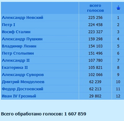 1. Александр Невский 225 256 2. Петр I 224 458 3. Иосиф Сталин 223 327 4. Александр Пушкин 159 298 5. Владимир Ленин 154 103 6. Петр Столыпин 151 496 7. Александр II 107 780 8. Екатерина II 105 821 9. Александр Суворов 102 066 10. Дмитрий Менделеев 62 239 11. Федор Достоевский 62 213 12. Иван IV Грозный 29 802 --- Как видим Сталин уверено сокращает разрыв и в плотную приблизился к первым местам, даже учитывая то что вчера не было бесплатных звонков в которых товарищ Сталин набирает больше чем другие. P.S. Так что активней товарищи!