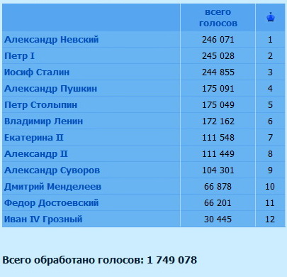 1. Александр Невский 246 071 2. Петр I 245 028 3. Иосиф Сталин 244 855 4. Александр Пушкин 175 091 5. Петр Столыпин 175 049 6. Владимир Ленин 172 162 7. Екатерина II 111 548 8. Александр II 111 449 9. Александр Суворов 104 301 10. Дмитрий Менделеев 66 878 11. Федор Достоевский 66 201 12. Иван IV Грозный 30 445