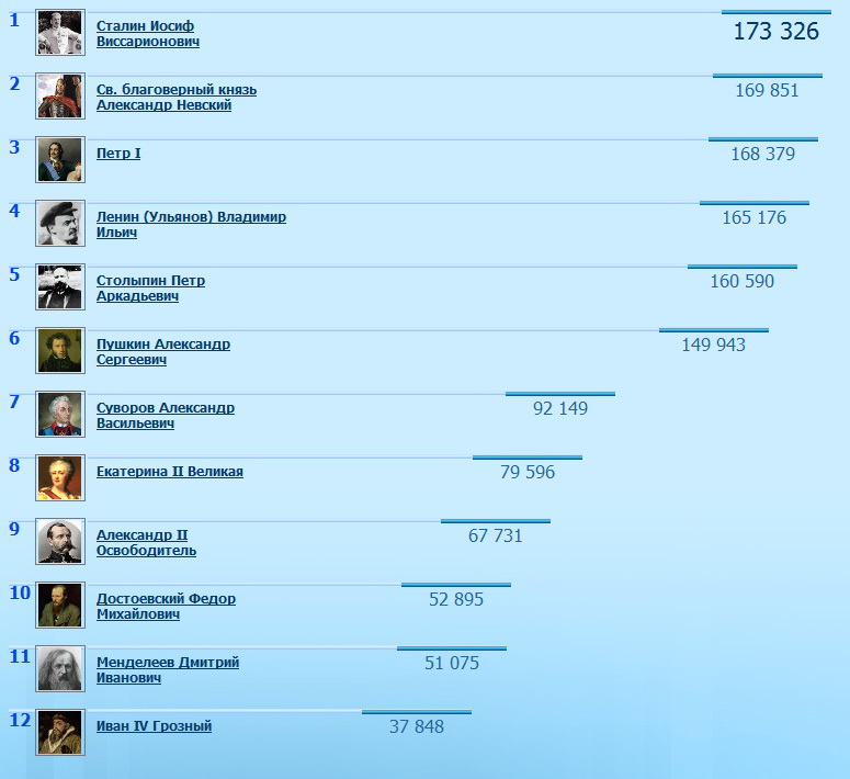 1 Сталин Иосиф Виссарионович 172 359 2 Св. благоверный князь Александр Невский 168 361 3 Петр I 168 137 4 Ленин (Ульянов) Владимир Ильич 161 504 5 Столыпин Петр Аркадьевич 158 040 6 Пушкин Александр Сергеевич 149 711 7 Суворов Александр Васильевич 92 009 8 Екатерина II Великая 79 508 9 Александр II Oсвободитель 67 607 10 Достоевский Федор Михайлович 52 820 11 Менделеев Дмитрий Иванович 50 977 12 Иван IV Грозный 37 041