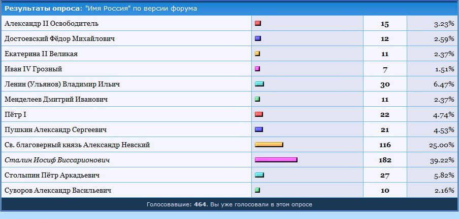 Сталин И.В. 174 503 Александр Невский 170 705 Ленин В.И. 169 325 Петр I 168 505 Столыпин 161 629 Пушкин А.С. 150 074 Суворов 92 215 Екатерина II 79 629 Александр II 67 769 Достоевский 52 936 Менделеев 51 127 Иван IV Грозный 38115