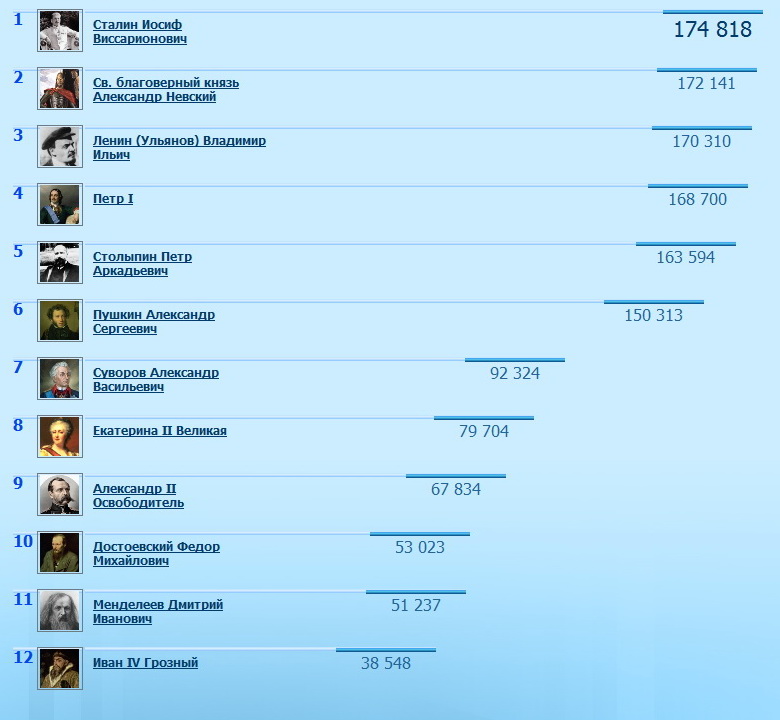 1 Сталин Иосиф Виссарионович 174 818 2 Св. благоверный князь Александр Невский 172 141 3 Ленин (Ульянов) Владимир Ильич 170 310 4 Петр I 168 700 5 Столыпин Петр Аркадьевич 163 594 6 Пушкин Александр Сергеевич 150 313 7 Суворов Александр Васильевич 92 324 8 Екатерина II Великая 79 704 9 Александр II Oсвободитель 67 834 10 Достоевский Федор Михайлович 53 023 11 Менделеев Дмитрий Иванович 51 237 12 Иван IV Грозный 38 548