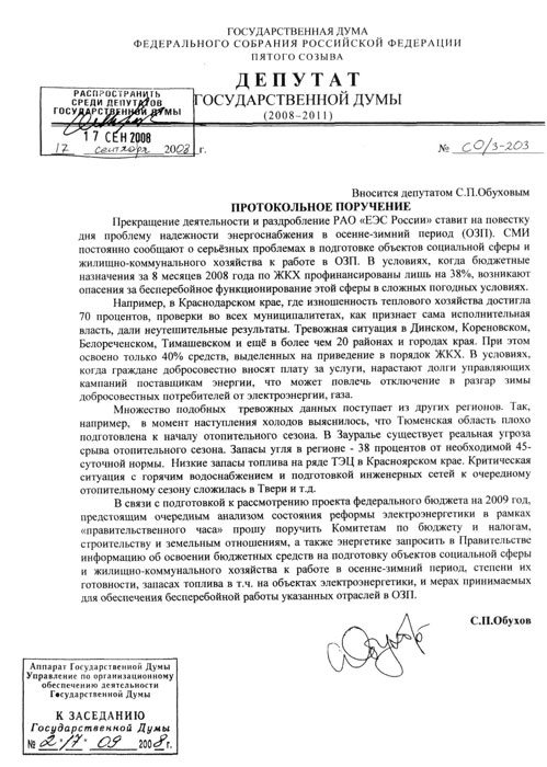 В связи с подготовкой к рассмотрению проекта федерального бюджета на 2009 год, предстоящим очередным анализом состояния реформы электроэнергетики в рамках «правительственного часа» прошу поручить Комитетам по бюджету и налогам, строительству и земельным отношениям, а также энергетике запросить в Правительстве информацию об освоении бюджетных средств на подготовку объектов социальной сферы и жилищно-коммунального хозяйства к работе в осенне-зимний период, степени их готовности, запасах топлива в т.ч. на объектах электроэнергетики, и мерах принимаемых для обеспечения бесперебойной работы указанных отраслей в ОЗП.