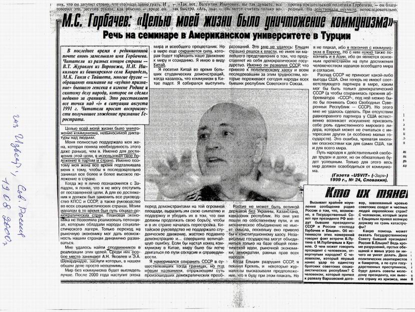 Горбачёв: "Целью моей жизни было уничтожение коммунизма" (газетная статья с интервью)