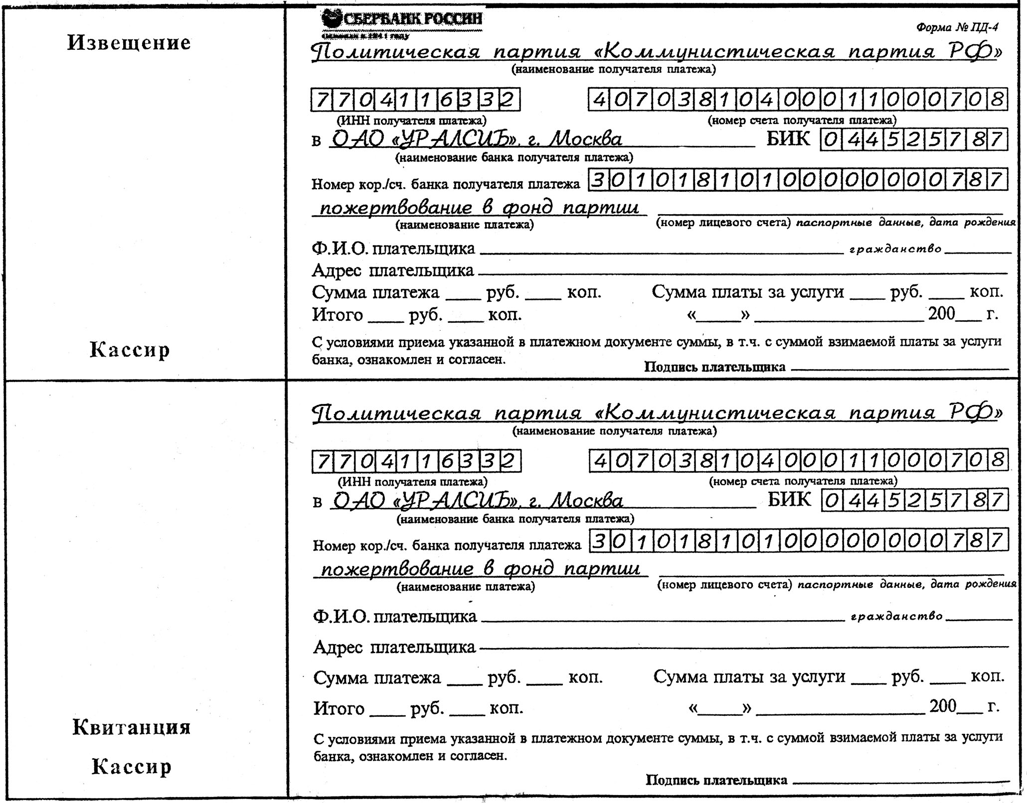 Уважаемые соотечественники! 2 декабря 2007 года войдет в историю России как день национального унижения. Избирателей буквально выгнали к избирательным урнам, учинили массовую фальсификацию итогов голосования.КПРФ – единственная из всех оппозиционных партий – устояла под тотальным нажимом, получила дополнительно в сравнении с прошлыми выборами более полумиллиона голосов. Конституция страны дает наибольшие властные полномочия президенту. А это значит, что мы просто не имеем права быть в стороне от президентских выборов хотя бы потому, что обязаны сказать правду людям о том, что ожидает их в результате ошибочного выбора. Партия представляет избирателю свою программу, своего кандидата. Съезд КПРФ выдвинул кандидатом на должность президента России Председателя ЦК КПРФ Геннадия ЗЮГАНОВА. Это решение всей партии и широкой коалиции патриотических сил. Мы готовы к борьбе за власть трудового народа. Заранее знаем, что она будет неравной и тяжелой. Но кто сказал, что победа бывает легкой? Разве легко было нашим отцам и дедам в пору Великой Отечественной? Разве защищать свои социальные права, бороться за бесплатное образование и здравоохранение, за достойную жизнь ветеранов и молодежи, врачей и учителей, воинов и ученых, рабочих и крестьян не святое дело?! Мы знаем, что для разъяснения своей позиции необходимы миллионы экземпляров газет и листовок, теле- и радиоэфир. Это требует немалых средств. Вот почему мы обращаемся к вам с просьбой оказать посильную материальную помощь нашему кандидату, нашей партии. Только так мы сможем освободить страну от криминально-бюрократической диктатуры. Выстоять и победить! Центральный Комитет КПРФ Бланк квитанции http://kprf.ru/party/contact/blanc.html Источник: kprf.ru