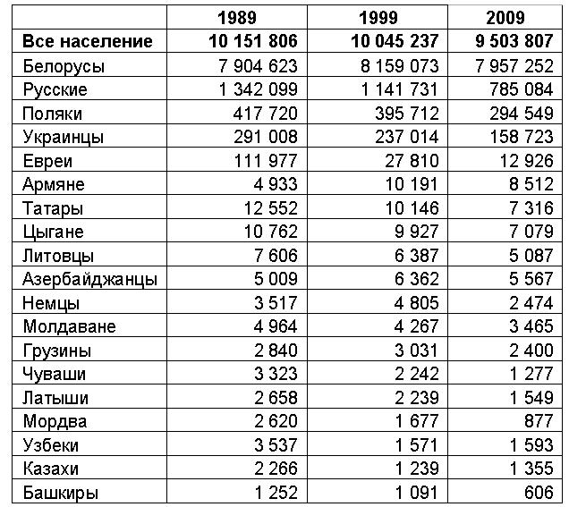 Численность белорусов в Белоруссии выросла на 52.6 тыс. чел. Зато: Численность русских в Белоруссии снизилась на 557 тыс. чел. Численность украинцев в Белоруссии снизилась на 132 тыс. чел. Численность поляков в Белоруссии снизилась на 123 тыс. чел. Численность евреев в Белоруссии снизилась на 99 тыс. чел. Русских, украинцев и поляков из славян вы уже исключили? И не хотите ли спросить батьку, как он ликвидировал полмиллиона русских?