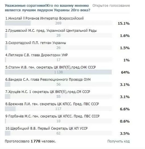 В сообществе за союз России, Украины и Белоруссии проводится забавный опрос на тему "Лучшего лидера Украины XX века". Победитель опять вполне традиционный и как я уже говорил, такие опросы надо проводить по схеме "Лучший лидер чего нибудь кроме Сталина" иначе все эти опросы становятся немного предсказуемыми. Так же немало улыбнуло второе место Николая II. Хотя если по существу, то в победителях опроса есть определенная сермяжная правда. При Николае II на Украине формировались зачаточные формы будущей "самостоятельности", что и проявилось в многочисленных "самостийных" правительствах 1917-1920 годов, первое из которых сложилось буквально в считанные дни после низвержения Романовых. В различных конспирологических теориях пытающихся доказать, что украинцев создал Ленин, обычно забывают, что первое украинское правительство появилось практически сразу после Февраля 1917 года, а первые украинские национальные части были сформированы на базе частей Киевского Военного Округа Временным правительством. Так что корни политической самостоятельности уходят как раз в правление Николая II. Ну а при Сталине, был фактически завершен сбор Украины в ее нынешней форме - такое вот тяжелое тоталитарное наследие сталинизма, от которого Украина почему то не спешит избавляться. В опросе почему то отсутствует Кравчук, благодаря которому Украина формально получила "незалежность", но по большому счету, Горбачев тут более логичен, ибо без Горбачева, Кравчук бы так и остался еще одним советским союзным руководителем. Так же странно видеть тут Бандеру, который если где и имел когда-то власть, то разве что над крайне небольшим кусочком Украины. В общем, довольно попсовый опрос. Если говорить о том, когда лучше всего жилось на Украине, то очевидно с точки зрения обычного человека, лучше всего жилось при Брежневе или точнее при Щербицком. С точки зрения развития, разумеется наибольший вклад внесли Ленин и Сталин. http://www.russia.ru/news/politics/2.../26/19238.html |