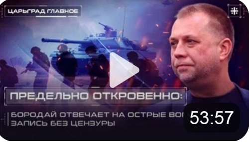 http://tsargrad.tv/shows/predelno-ot....google.com%2f Депутат Госдумы Александр Бородай в эксклюзивном интервью Юрию Пронько в «Царьград. Главное» комментирует актуальные и злободневные темы. Разговор без купюр и цензуры. А. Бородай в интервью откровенно демонстрирует менталитет руководства России в отношении переговоров с Украиной, будущего России и Украины, их отношений. СПРАВКА Алекса́ндр Ю́рьевич Борода́й (род. 25 июля 1972], Москва, РСФСР, СССР) — российский государственный деятель, политолог, журналист (военный корреспондент), предприниматель. Депутат Государственной думы Федерального собрания Российской Федерации VIII созыва, член комитета Государственной думы по делам СНГ, евразийской интеграции и связям с соотечественниками с 12 октября 2021 года. Член фракции «Единая Россия». 16 мая 2014 года объявил себя председателем Совета министров подконтрольной России Донецкой Народной Республики (до 7 августа 2014). Генеральный советник, заместитель председателя Совета министров ДНР Александра Захарченко (8 августа — 20 октября 2014). Глава «Союза добровольцев Донбасса» с 2015 года. Википедия |