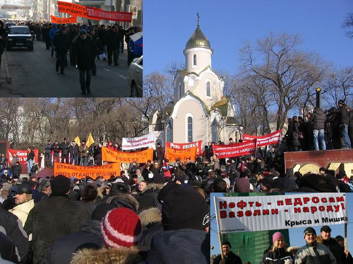Невиданные до последнего времени массовые акции протеста прошли сегодня во Владивостоке. Они наглядно показали, чего стоят хваленый «план Путина» и «путинская стабильность», «102-процентное» голосование за «Единую Россию». Поводом для перекрытия трасс и протестных выступлений стало предстоящее вступление в силу 11 января следующего года принятого 10 декабря 2008 года постановления правительства России, подписанного В.В.Путиным, о повышении таможенных пошлин на легковые и грузовые иномарки. Эта мера, как было объявлено, принимается с целью защиты отечественных производителей, а также зарубежных компаний, которые производят сборку машин на территории РФ. Постановление вызвало волну недовольства среди автомобилистов Приморья, поскольку в крае, именно благодаря политике Путина и «Единой России», сегодня более 90% легковых автомобилей - японские иномарки. И принудив две сотни тысяч граждан выживать за счет доставки, продажи и сервиса иномарок, правительство Путина одним росчерком пера, не разработав каких-либо компенсирующих механизмов и мер, лишило жизненных перспектив львиную долю того самого «среднего класса» в Приморье, о любви к которому вещают все документы «Единой России». Организации КПРФ, поддерживая протестующих, решительно требует от правительства Путина конкретных мер государственной помощи не олигархам, а простым гражданам, теряющим работу и свое небольшое дело.