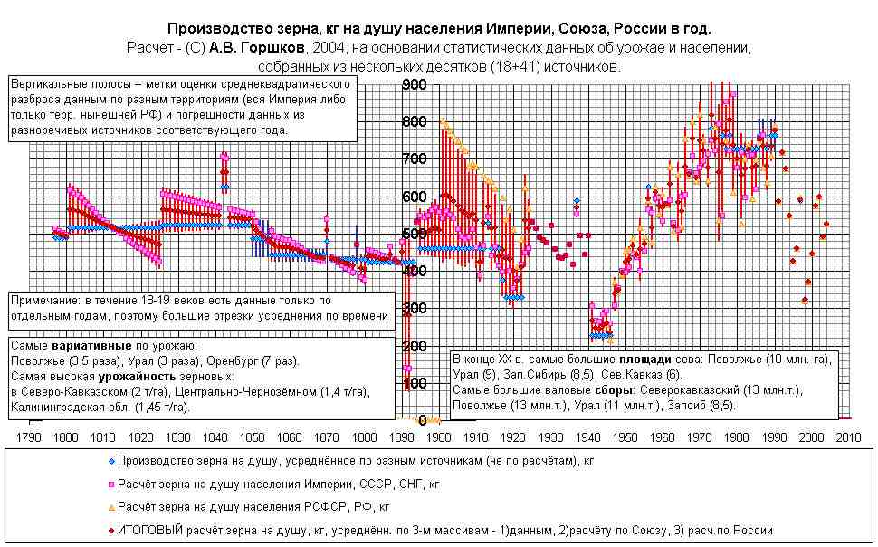 (извините, что в этом 2-м блоке я выкладываю графики не по порядку, а пока выборочно -- нет сегодня времени) Резкие "пилы" за 19-й век -- артефакты. Вызваны наложением данных о росте населения на имеющиеся у меня лишь усреднённые за большие периоды сборах зерна в 19-м веке. |