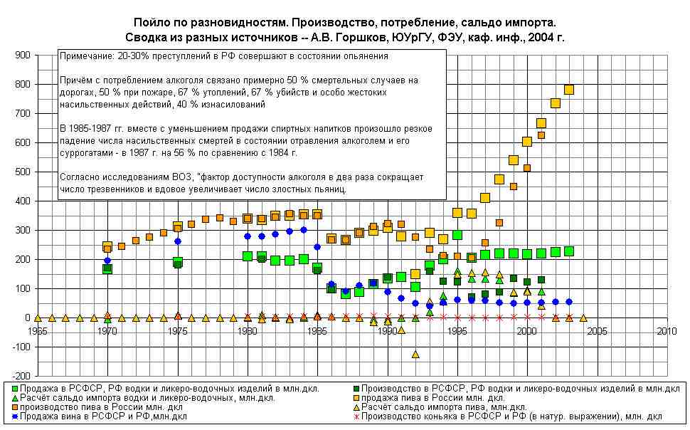 Расчёт А.В. Горшкова учитывает % алкоголя в составе потребляемого пойла. Эффективный % алкоголя в потребляемых сортах пива выяснен с помощью социологического опроса среди мужчин 20-40 лет. Увеличивающий коэффициент на нелегальное производство не вводился, расчёт только по легальным продажам. Судя по пропорциональному падению (в трезвую пятилетку имени Углова и Лигачёва) алкогольной и желудочной смертности, падение продаж алкоголя лишь в малой мере компенсировалось увеличением нелегального производства. В те годы в СССР увеличилось изобилие и снизились цены на фруктовые соки, и качество их было гораздо выше, чем сейчас. 100% сок, без добавления воды. Цены 1987 г. за 3-литровую банку (изготовлен из свежих фруктов, не из порошка; без консервантов; без добавления воды): Яблочный сок 100% -- от 1,20 (с мякотью) до 2,20 (осветлённый). Виноградный сок 100% -- около 5 руб. (выпивал 1,5 литра с чёрным хлебом и ехал на велосипеде по Подмосковью и Москве на расстояние 50-100 км в сутки; вечером возвращался и допивал остальное с чёрным же хлебом) Гранатовый сок 100% -- около 7 руб. (выпить полстакана в сутки реально, выпить стакан -- подвиг, губы и зубы чёрные, выпил 2 стакана с чёрным хлебом -- и можно бежать 20 км на всероссийских соревнованиях). Берёзовый сок 100% осветлённый с сахаром -- 1,20-2,20 Сливовый, томатный, морковно-яблочный, тыквенно-яблочный, персиковый, айвовый, абрикосовый... Не забыли? Интегрально за трезвую пятилетку сбережено около 1 млн. жизней -- неубитых, несбитых автомобилями... |