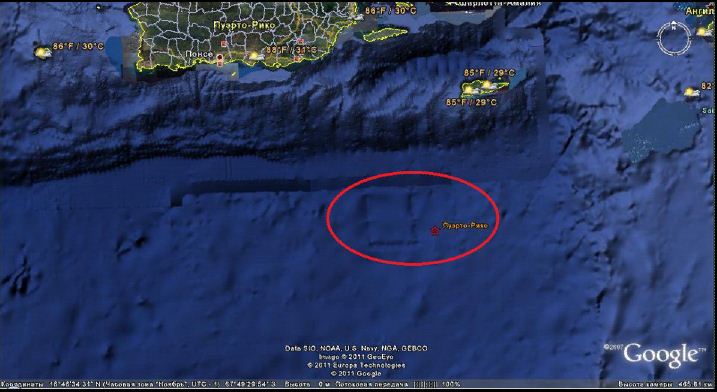 Этот квадратик, размеры которого 36*32 км, находится на глубине 4650 м. Вверху полоска это не проработка Google. |