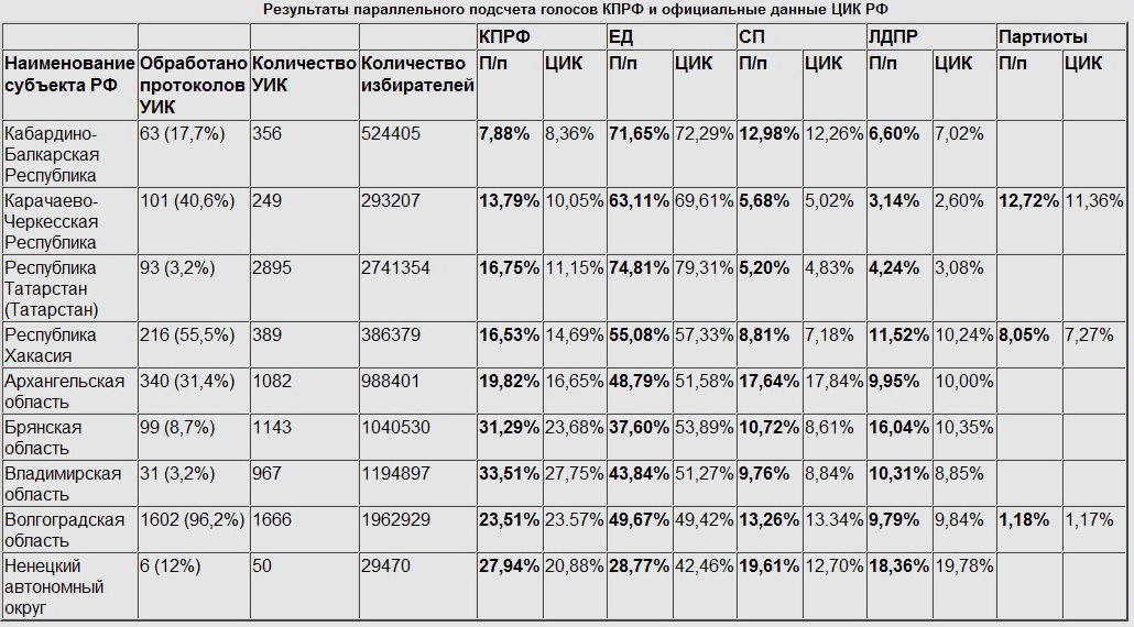 Пресс-служба ЦК КПРФ К вечеру 2 марта в ходе параллельного подсчета в Республике Татарстан обработаны протоколы 66 участковых избирательных комиссий из 2895 (2,3%). По этим данным, за КПРФ отдано 17,93% голосов, за «Единую Россию» – 72,51%, за «Справедливую Россию» –5,47%, за ЛДПР – 4,46%. В Республике Хакасия обработаны протоколы 216 участковых избирательных комиссий из 389 (55,5%). КПРФ получает 16,53% голосов, «Единая Россия» – 55,08%, «Справедливая Россия» – 8,81%, ЛДПР – 11,52%, «Патриоты России» – 8,05%. В Архангельской области обработаны протоколы 102 избирательных комиссий из 1082 (9,4%). КПРФ получает 20,15% голосов, «Единая Россия» – 46,58%, «Справедливая Россия» – 17,76%, ЛДПР – 12,32%. В Брянской области обработаны протоколы 91 из 1143 избирательных комиссий (8,0%). КПРФ набирает 31,33% голосов, «Единая Россия» – 36,92%, «Справедливая Россия» – 11,01%, ЛДПР – 16,38%. Во Владимирской области обработаны протоколы 7 из 967 избирательных комиссий (0,7%). КПРФ получает 33,16% голосов, «Единая Россия» – 44,09%, «Справедливая Россия» – 9,87%, ЛДПР – 9,92%. В Волгоградской области обработаны протоколы 1602 из 1666 участковых избирательных комиссий (96,2%). КПРФ набирает 23,51% голосов, «Единая Россия» –49,67%, «Справедливая Россия» – 13,26%, ЛДПР – 9,79%, «Патриоты России» – 1,18%. В Ненецком автономном округе обработаны протоколы 6 из 50 (12%) избирательных комиссий. По этим данным КПРФ набирает 27,94% голосов, «Единая Россия» – 28,77%, «Справедливая Россия» – 19,61%, ЛДПР – 18,36%. Параллельный подсчет голосов продолжается. Источник: kprf.ru