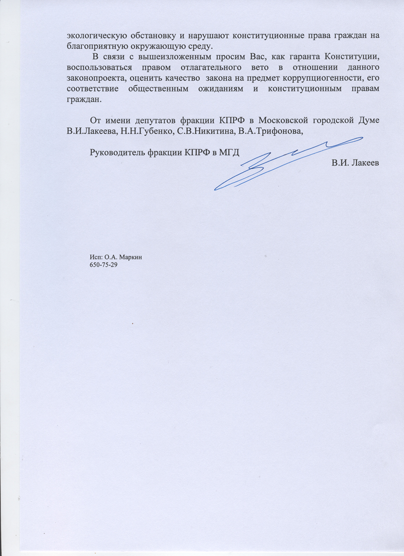 От имени депутатов фракции КПРФ в Московской городской Думе В.И.Лакеева, Н.Н.Губенко, С.В.Никитина, В.А.Трифонова,
