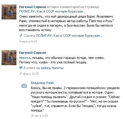 Видимо, своё патриотическое отношение к нашей истории академик Рамм передал и членам своей семьи, причём не только ближайшим. Которые решительно отказались проспекулировать - как большинство - на реальных или вымышленных страданиях своих предков при Сталине. Прочтя эту наглую ложь Гофмана, племянник Рамма, Евгений Соркин возмутился на страничке "ВКонтакте": Смею заметить, что мой двоюродный дядя Борис Яковлевич Рамм, упомянутый в интервью автор работы 'Папство и Русь" никогда не сидел в лагерях, а был выслан. Было бы неплохо восстановить истину Ссылка ПОЛИТ.РУ: Как в СССР изучали буржуазн.. Для тех, кто сидит в "контакте", ссылка http://vk.com/id5336719. А для остальных картинка. Картинку делал супруг, поэтому все претензии к нему. Я честно просила его отрезать лишнее. Но он настоял - "пусть мужики посмеются". |