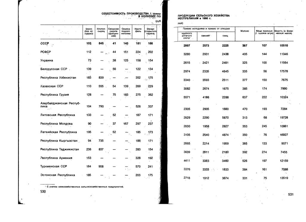 1. В производстве яйца - 1 место ; 2. Молока - 4 место ; 3. Зерна - 9 место ; 4. Привеса молодняка крупного рогатого скота - 7 место ; 5. Привеса молодняка свиней - 5 место ; 6. Привеса молодняка овец - 13 место ; 7. Картофеля - 1 место ; 8. Овощей ( открытого грунта ) - 1 место . Народное хозяйство СССР в 1990 году