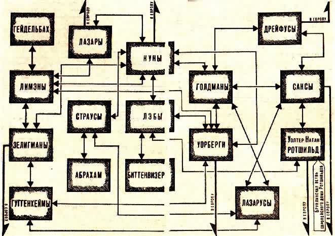 Очень упрощенная схема СЕМЕЙНЫХ связей некоторых финансовых и торговых домов США, участвующих в ФИНАНСИРОВАНИИ деятельности СИОНИЗМА.
