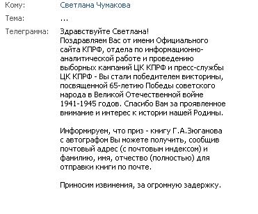 Света, поздравляю тебя! Молодец! Очень приятно, что ты, один из наших авторов и наша подруга, выиграла конкурс КПРФ!