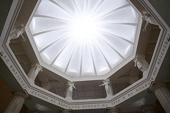 Тогда из вестибюля Курской были убраны не только надписи, но и памятник вождю, располагавшийся в центральной нише. Статую руководители метро почему-то решили не восстанавливать, объяснив это тем, что ее оригинал пропал из запасников метро. "Мы прорабатывали вопрос установки другого памятника, но решили на том месте, где стоял Сталин, оставить световую нишу", – заметил Гаев.