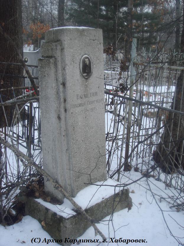 Уже много лет посещая Центральное кладбище г. Хабаровска обращал внимание на могилу Володина Александра Георгиевича, участника гражданской войны. Могила находилась просто в ужасающем состоянии: памятник рассыпается, оградка распилена, на самой могиле и рядом с ней лежали кучи мусора. Месяц назад собрав группу товарищей решили привести захоронение в Божеский вид. Убрали с могилы мусор (18 мешков!!!), насыпали немного отсева, сейчас думаем об установлении новой ограды и реставрации памятника. В процессе работы возникло желание узнать об этом человеке как можно больше. Судя по ржавым венкам, которые мы естественно выбросили, Володина не навещали с года его похорон. На памятнике есть фотография на которой Александр Георгиевич запечатлён в форме Красной Армии 20-х годов, в звании командира батальона. Постараюсь на днях разместить этот снимок. Обращения в музеи и архивы пока положительного результата не дали. Сведений о нём у нас нет, кроме вот этих крупиц: