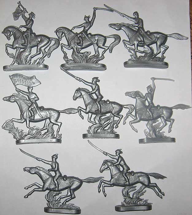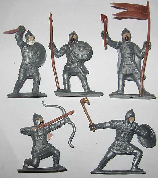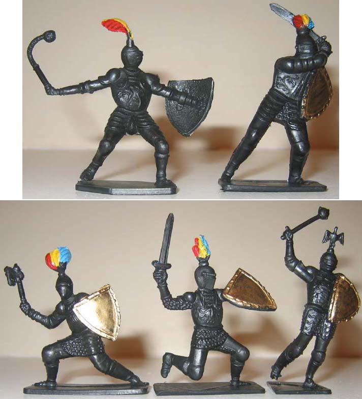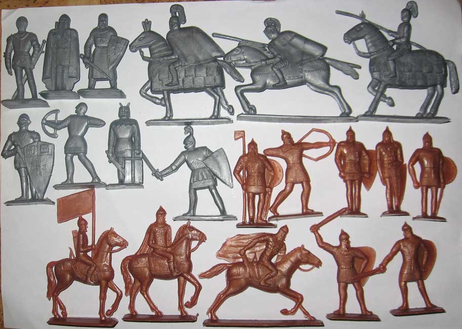 В СССР выпускали и объемных рыцарей. У меня есть оба набора (см. рис. № 1 и № 2). Мне в детстве эти солдатики очень нравились. Особенно металлические – они были такие тяжеленькие (самым ценным считался мотоциклист). И пластмассовые конники мне нравились (см. рис. № 3) – я выстраивал из них огромные армии, т.к. набор таких солдатиков был ДЕШЕВЫМ! И рыцари эти плоские пластмассовые нравились – у меня было сразу несколько одинаковых наборов. (см. рис. № 4). Конечно первые два набора лучше и появились они в СССР во второй половине 80-тых, а плоские наборы к этому времени стали делать в серебре, а не красными в дешевом пластике. Как говорили раньше с улучшением материального состояния стали появляться более дорогие и соттветственно более сложные игрушки. Цитата: