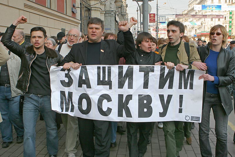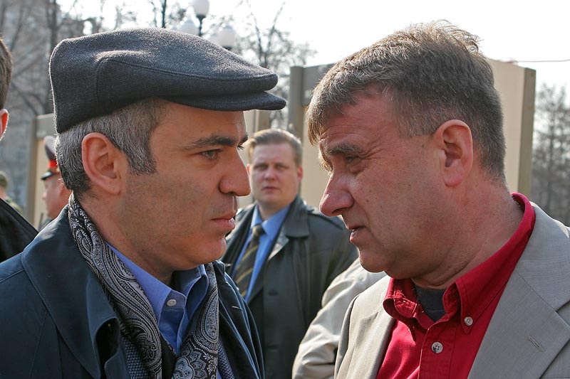 На снимке - П.П.Басанец с Каспаровым 31 марта на Пушкинской. Там же на марше от Пушкинской к Театрально (где проводила свой официальный митинг КПРФ) с ОГФ в одном рояду "яблочники" Яшин с Митрохиным и "член КПРФ" Петр Милосердов.