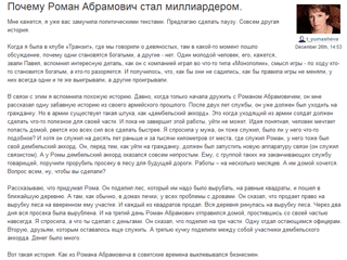 Дьяченко скромно умалчивает о том, как Абрамович покупал нефтянку у государства за бесценок и на взятые у государства кредиты. Стиль тот же, что и с лесом.